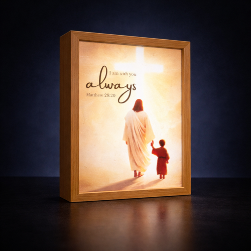 Your Kingdom's Light frame arrives with the wooden LED frame, your chosen double-sided faith art print, a power cable, and if selected, your free LED remote. Everything you need to hang it and light it up is included.